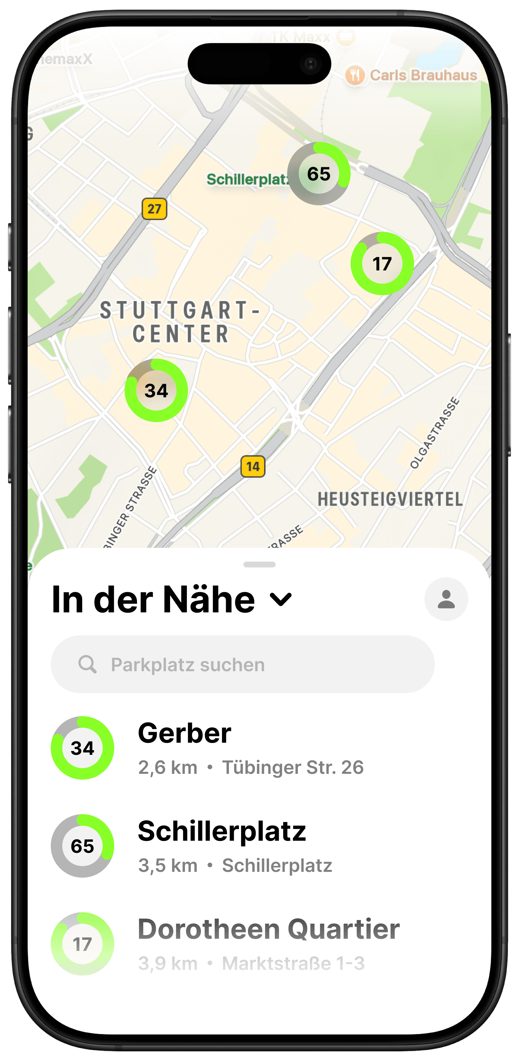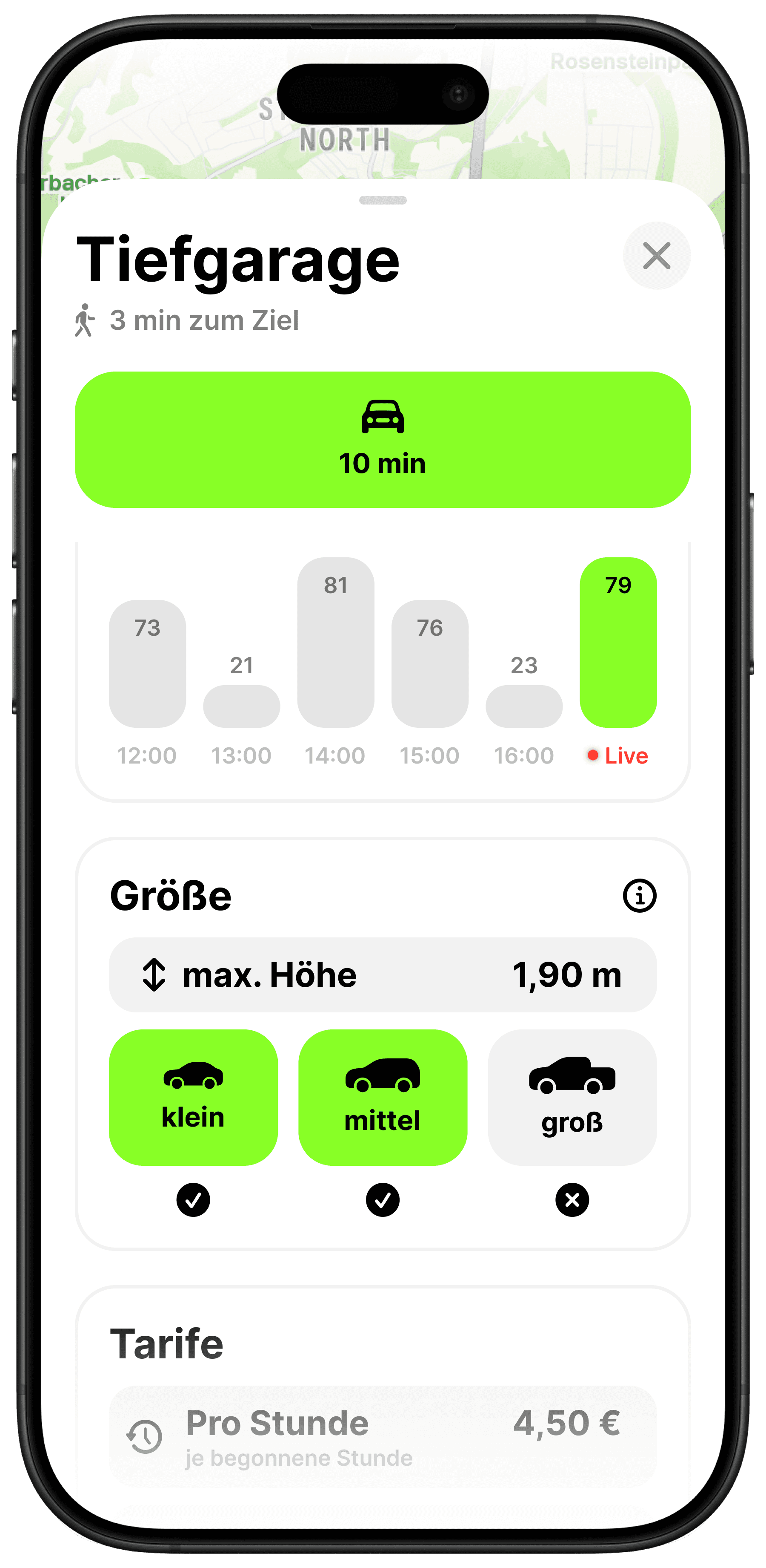 Mit Live-Daten siehst du jederzeit, wo Parkplätze frei sind und wo nicht. Transparent, aktuell und zuverlässig – finde den optimalen Stellplatz für dein Auto mit nur einem Klick.